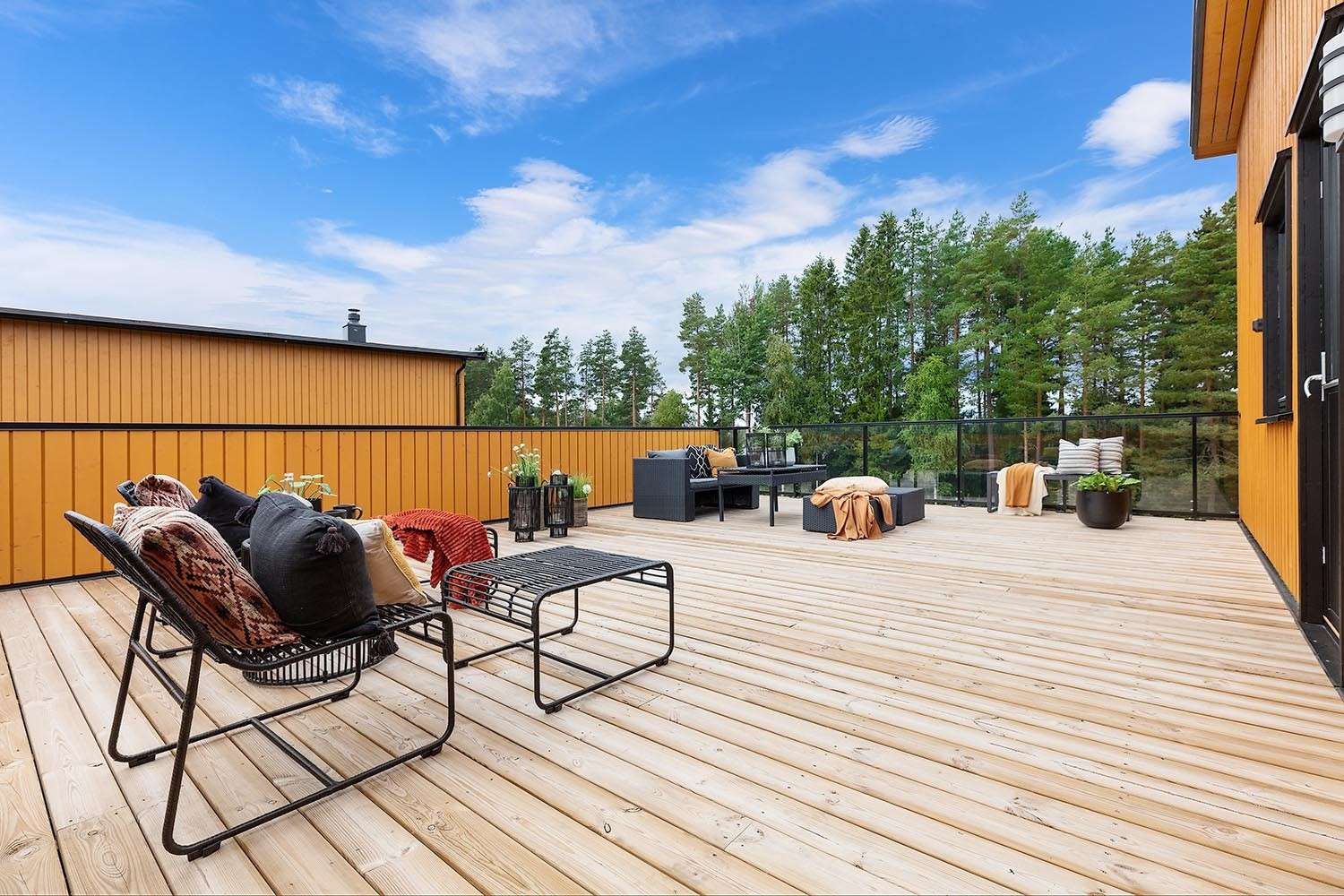 Stor takterrasse på ca. 46 kvm med optimale solforhold – denne må oppleves! Usjenert og fritt utsyn. Terrassen ligger på ende, med fritt utsyn på 3 sider. Tett rekkverk mot gårdsplass og glassrekkverk mot friområde. Spiler og håndløper i sort aluminium. Terrassegulv leveres med helsveiset membran og tremmegulv. Impregnert treplatting ved inngangsparti.