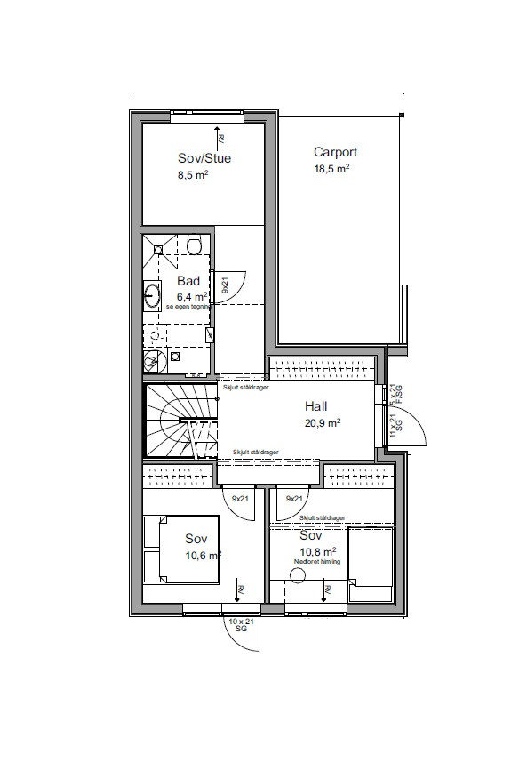 Boligens 2. etasje har et stort soverom med egen balkong hvor morgenkaffen kan nytes til flott utsikt og tidlig sol. Delikat og smakfullt bad med fliser på gulv og vegg. Badet godt utstyrt med et stort baderomsmøbel (Malin 120cm) med 2 servanter, dobbeldusj og vegghengt toalett fra Villeroy & Boch.