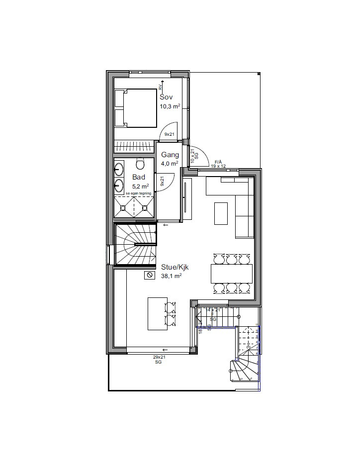 Videre har etasjen stue og kjøkken i åpen løsning. Kjøkken med innredning av dansk design (JKE), godt utstyrt med hvitevarer som stekeovn, induksjonstopp, oppvaskmaskin og kjøleskap med frysedel. Fra kjøkkenet har du også utgang via en heve- skyvedør til en vestvendt balkong. Via den vestvendte balkongen går det trapp opp til en nydelig takterrasse med sol fra tidlig morgen til sen kveld og en fantastisk utsikt!
