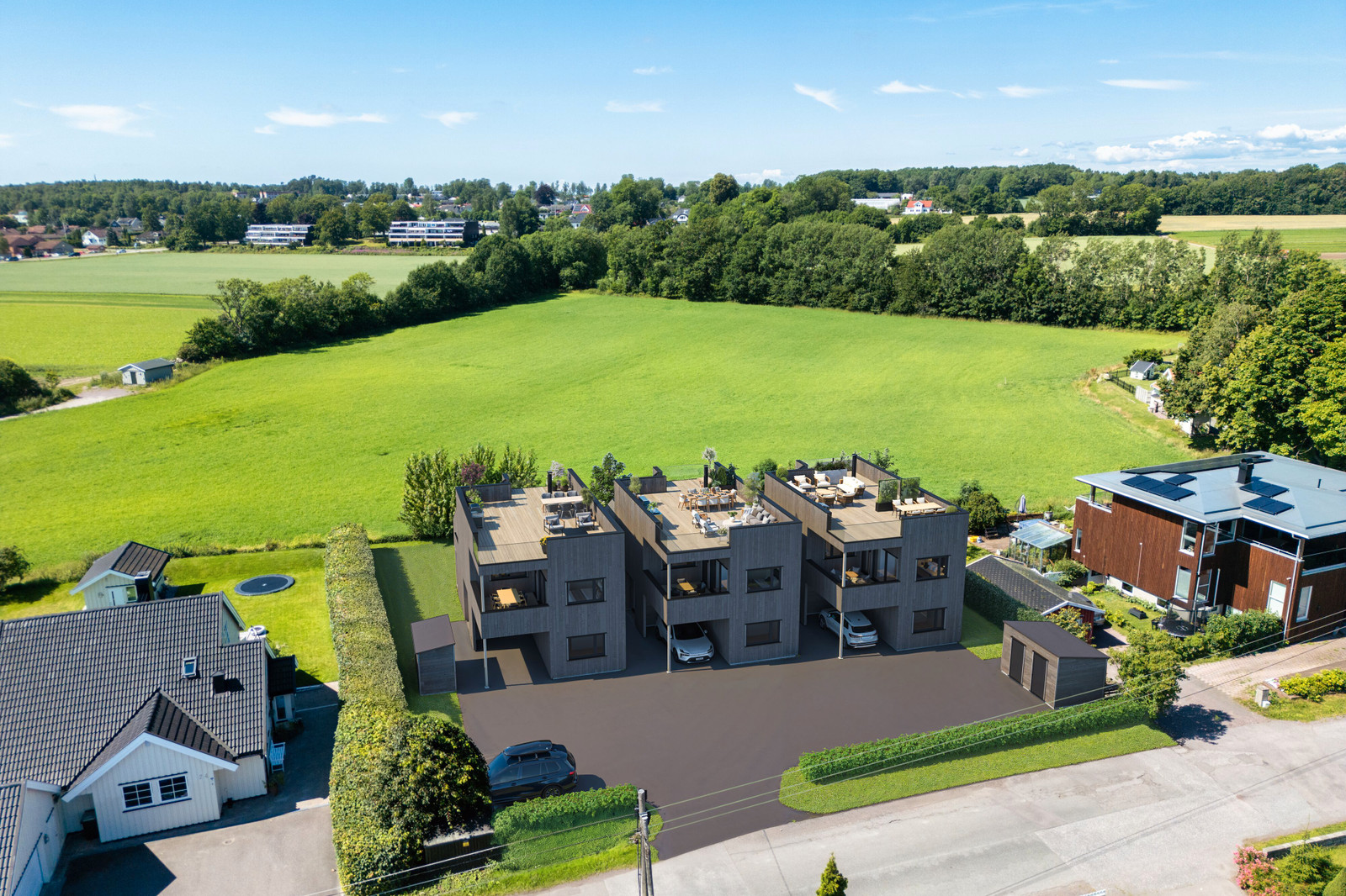 Det vil være asfalt i gårdsplasser samt inne i carporter. Tomtene leveres med et lag matjord og klart for tilsåing av plen.