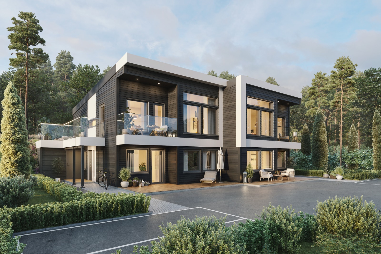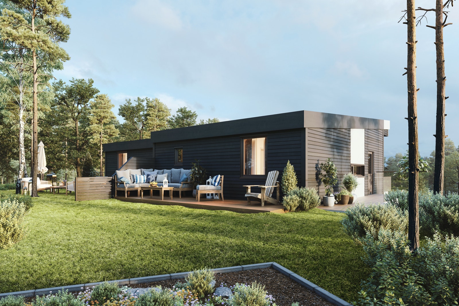 Uteområdet er omkransa av naturvennlege uteområder som sikrar privatliv i vakre, naturskjønne omgjevne. Vi har lagt vekt på at du skal få mest mogleg ut av uteområdet – ikkje minst den sørvendte hagen, som gir rom for privatliv tett på naturen.