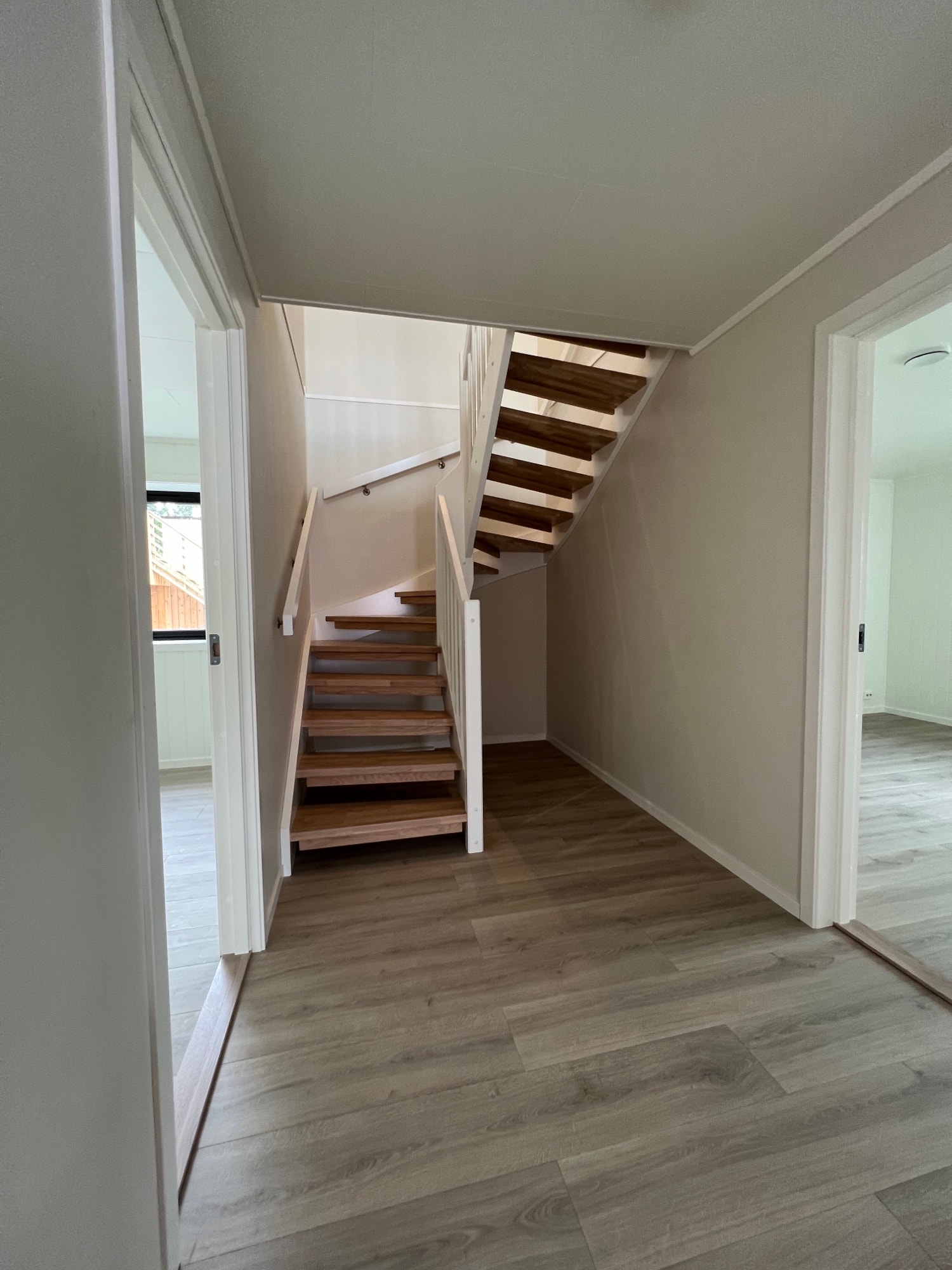 Trappene leveres i furu, med hvitmalte vanger/rekkverk og lakkerte trinn i eiketoning.