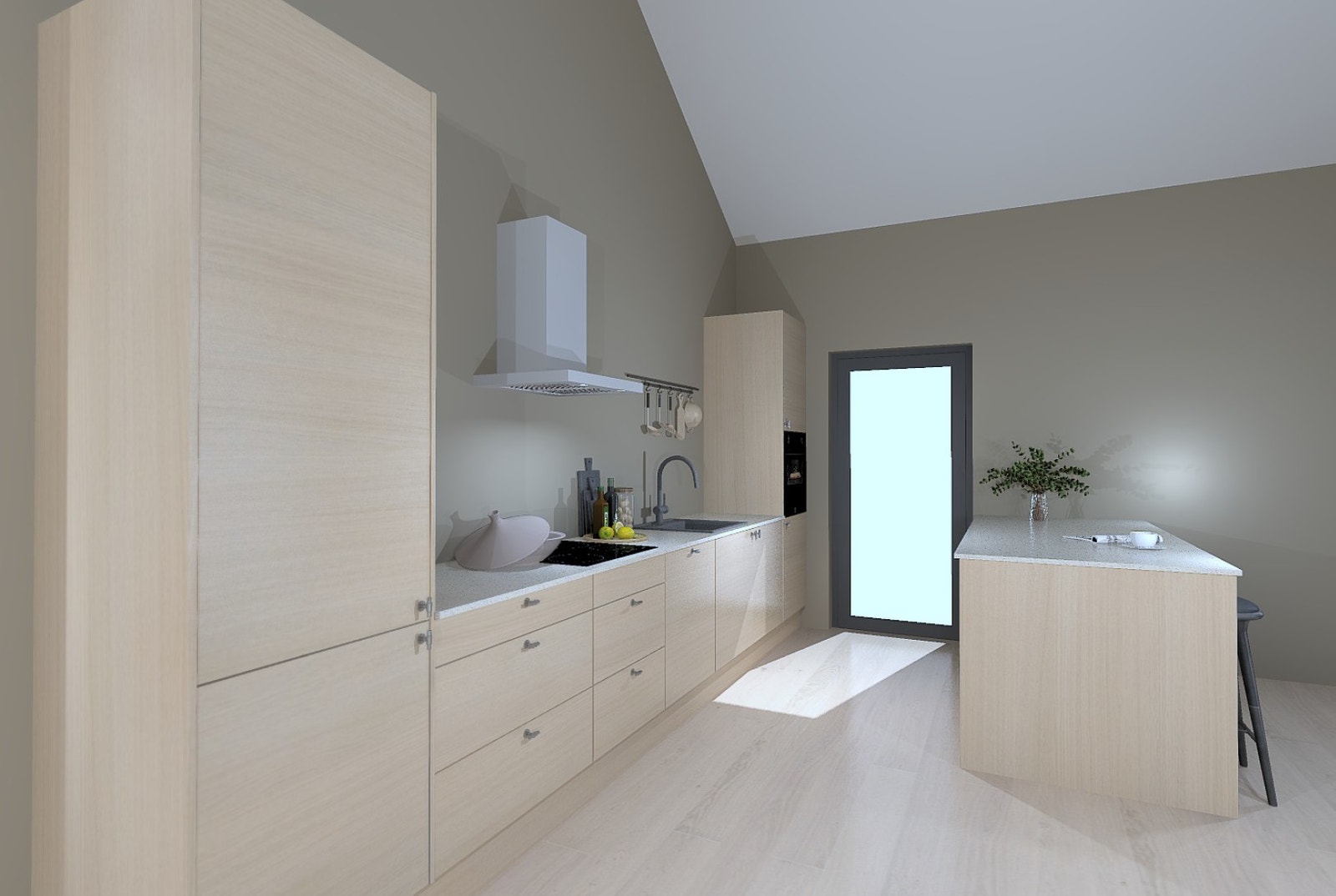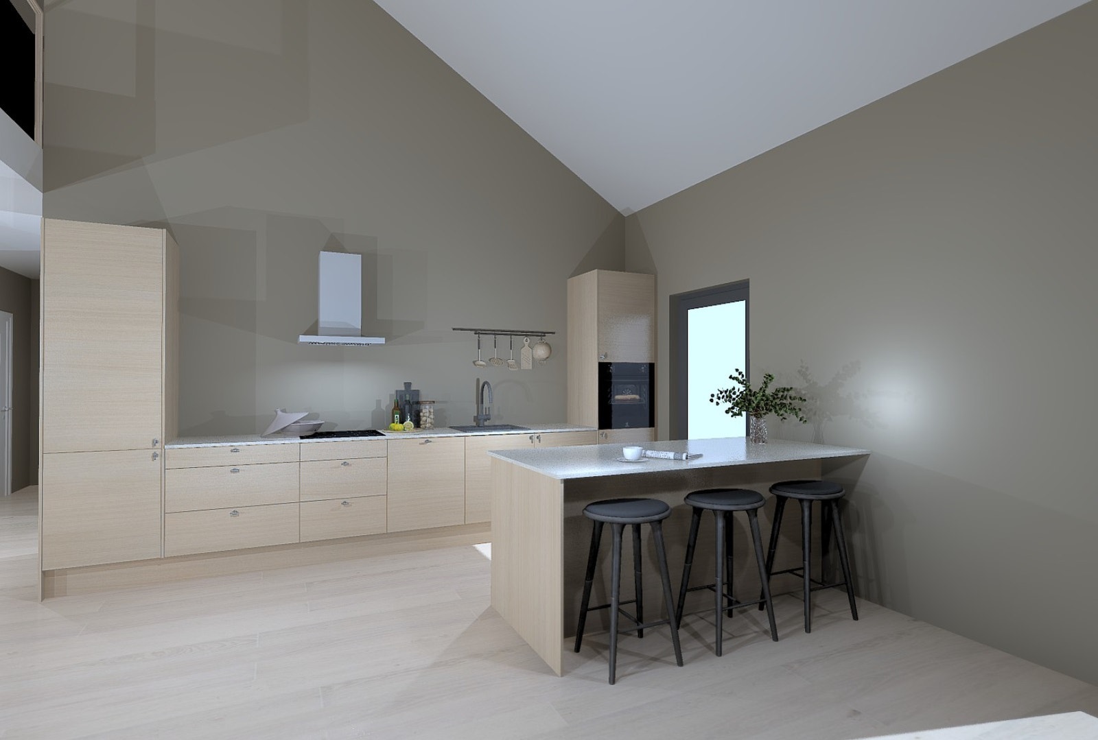 Kjøkkeninnredning med kjøkkenøy leveres av HTH eller JKE. Innredningene blir godt utstyrt med integrerte hvitevarer som stekeovn, induksjonstopp, oppvasksmaskin og kjøleskap med frysedel.