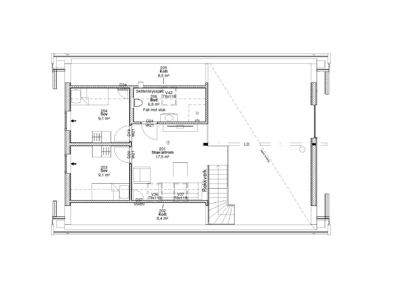 Boligens 2. etasje består av stue/allrom, 2 soverom og et delikat bad med dusjhjørne, servant og vegghengt wc.