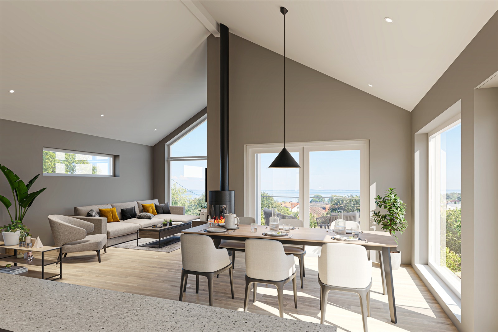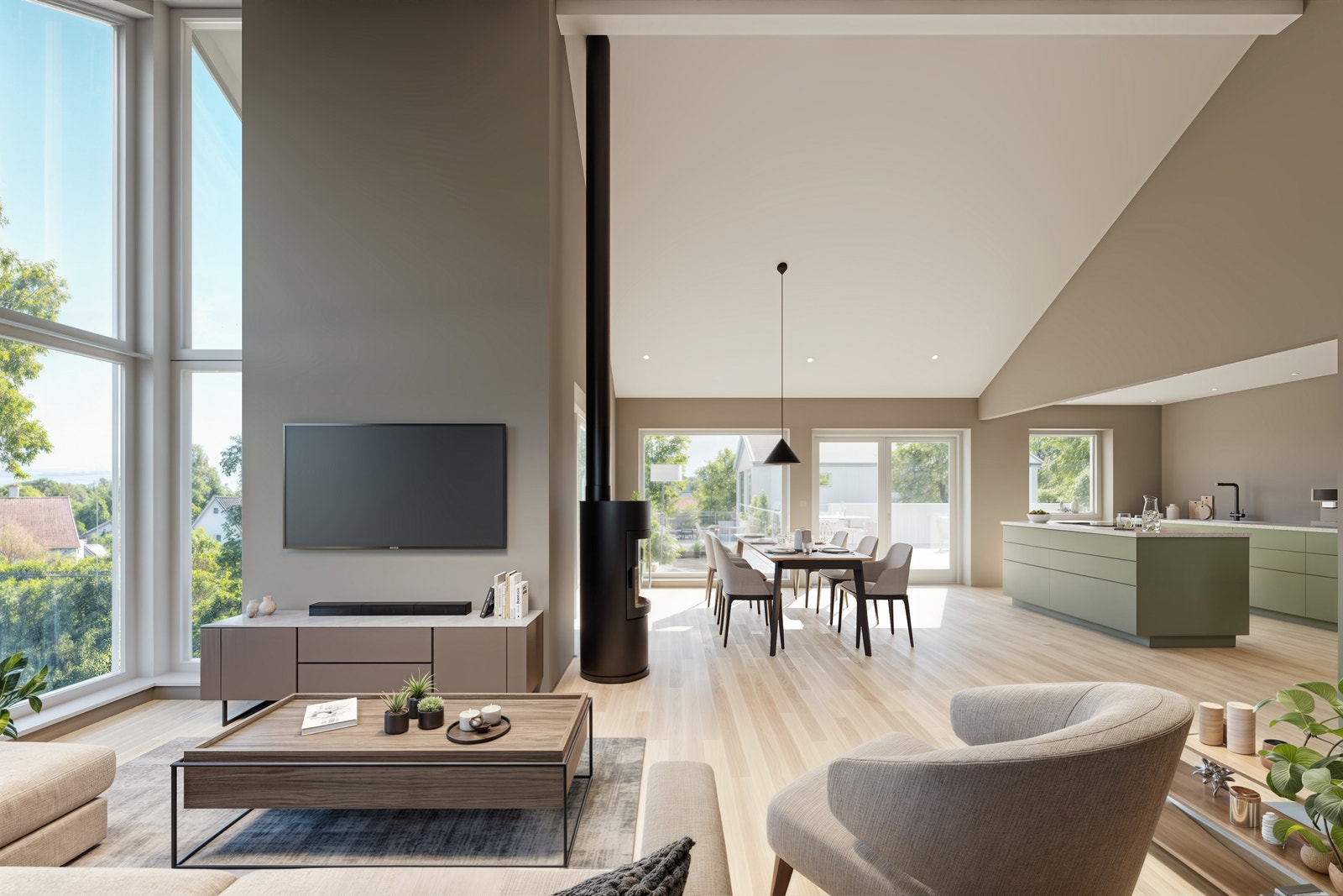 Boligene har romslige og gjennomgående stuer med åpen kjøkkenløsning og utgang til terrasser fra 2. etasje. Herfra vil det være nydelig utsikt. Boligenes 2. etasje er planlagt innredet med hhv. Stue/kjøkken, bad, wc-rom, soverom med tilknyttet garderoberom og kott. Underetasjer er innredet med entré, gang, to soverom, tv-stue, bad, vaskerom samt bod/teknisk rom.