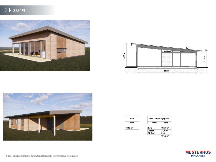 Boligens areal: P-rom 108 m2. BRA inkl. dobbel carport 151 m2