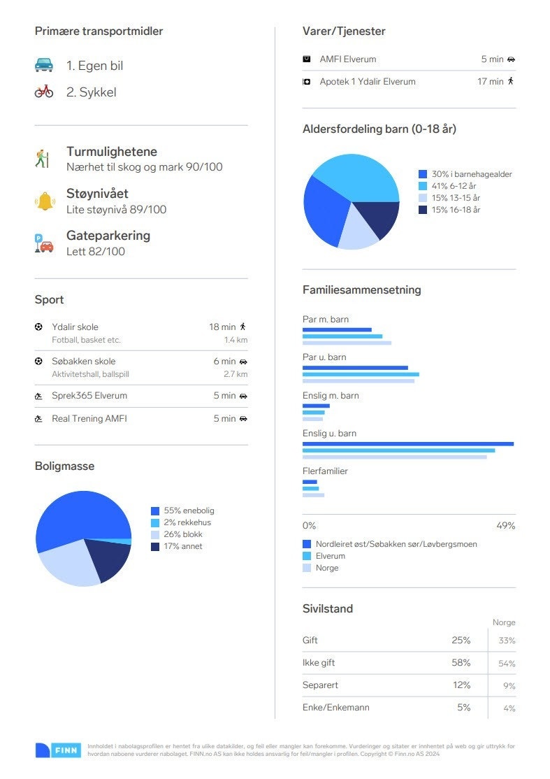 - Knappe 400 meter fra inngangsdøra ligger det bussholdeplass, med gode forbindelser. Togstasjon ligger kun 4 km unna i Elverum sentrum. Her finner du alt du trenger og mere til! Kjøpesenter, kulturhus, legesenter, apotek, kommunesenter, ungdomsskole og videregående skole.