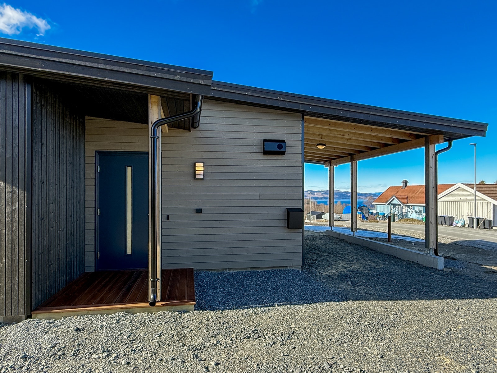 Bilen parkerer du i carporten rett rundt hjørnet for inngangsdøren.