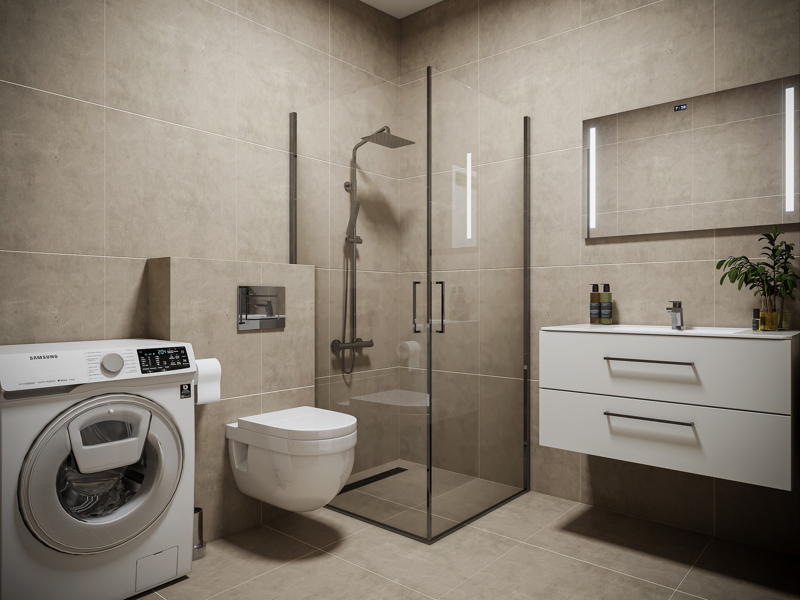 - Helflisede bad med moderne baderomsinnredning med skuffer, heldekkende vask og speil med lys