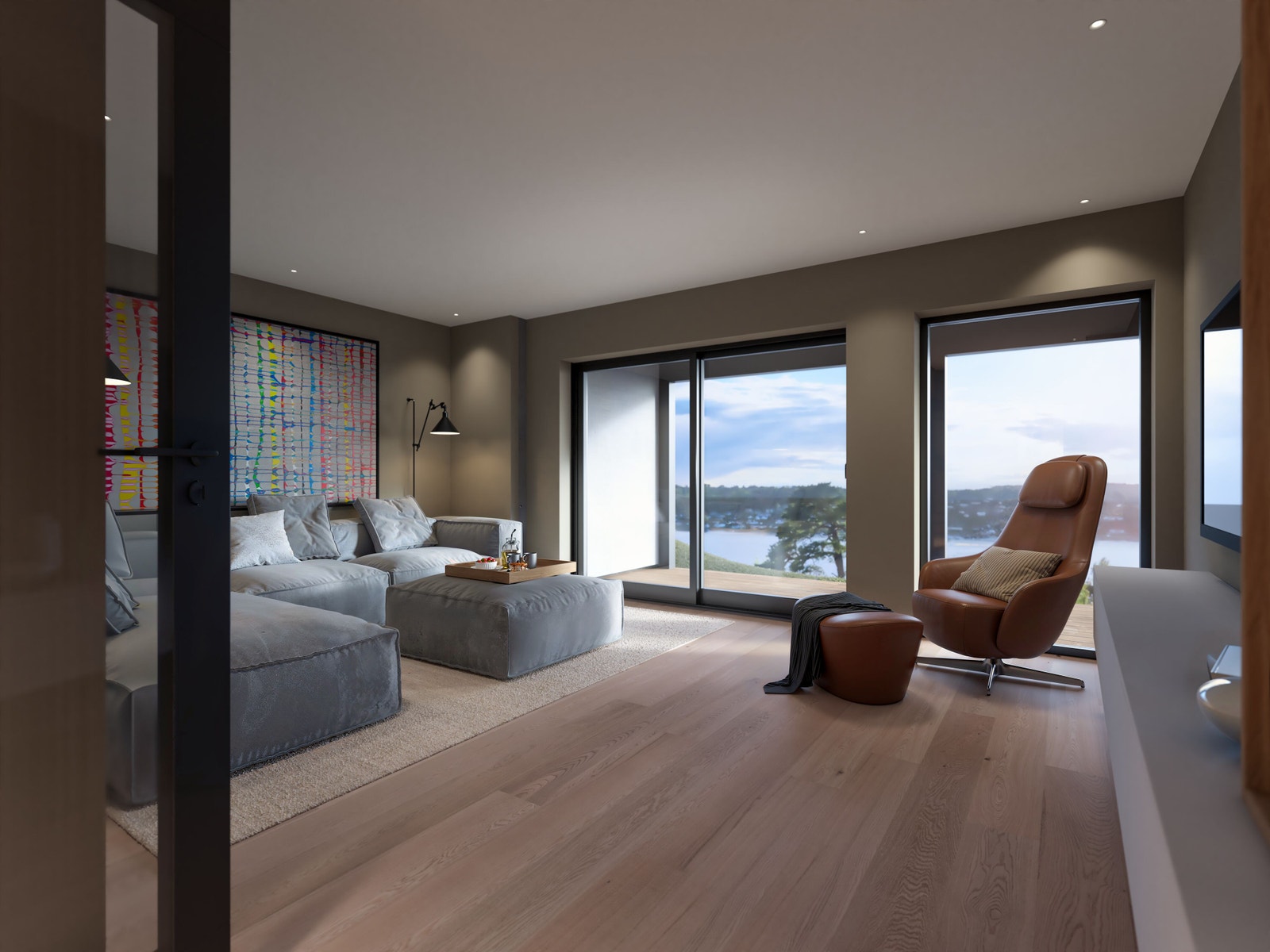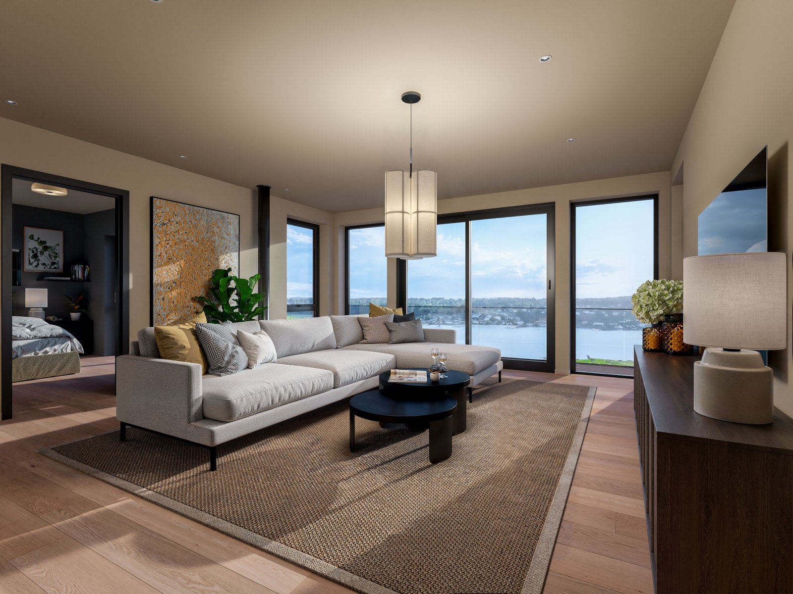 Videre opp i 2.etasje kommer man til en stor åpen stue/kjøkkenløsning på hele 61 kvm med panoramautsikt over Vestfjorden. Fra stuen er det tilgang til en stor terrasse med utgang både fra kjøkkenet og stua. Boligen har store vindusflater mot sjøen som både slipper inn godt med naturlig lys og er med å fremheve en virkelig flott utsikt.