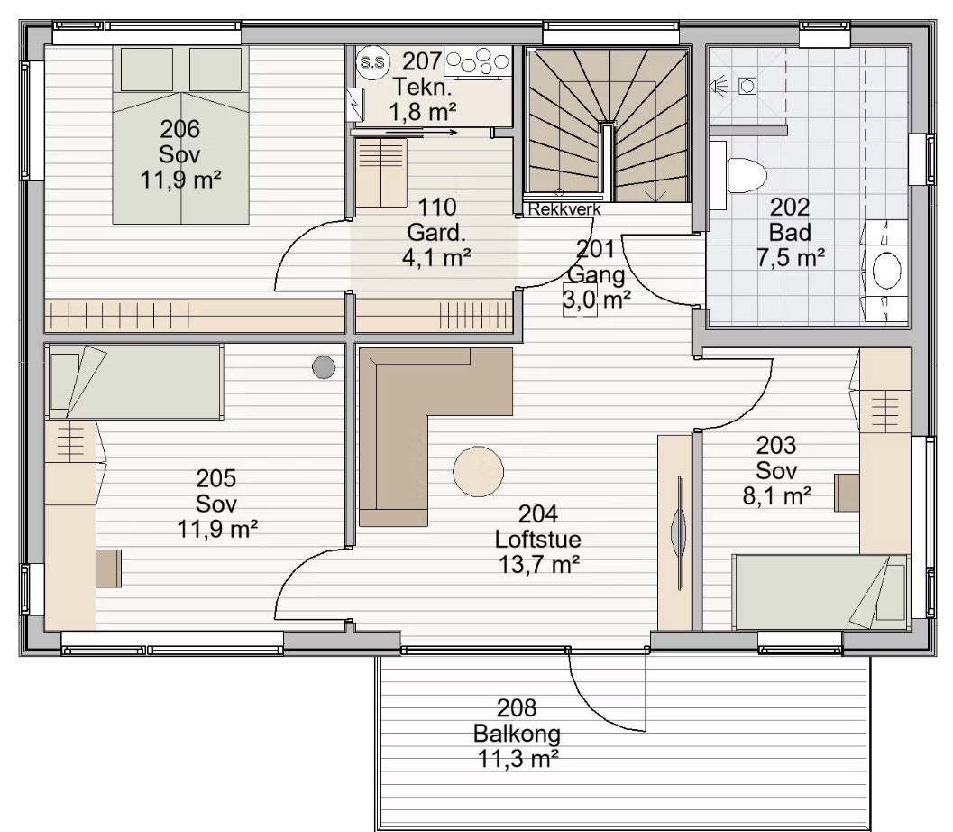 I andre etasje finner du tre romslige soverom, et bad og en loftstue som gir ekstra plass til lek, filmkvelder eller avslapning. Den tilknyttede balkongen gir en fantastisk utsikt og tilfører huset en ekstra moderne detalj som skiller det ut.