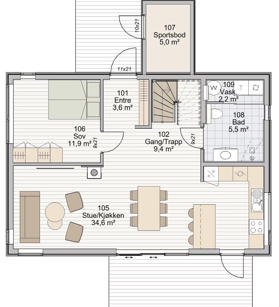 Illustrasjoner og tegninger som er vist i annonsen er et eksempel på hvordan fasade og planløsning kan være. 3D-illustrasjoner vil avvike fra virkelige forhold. Det tas forbehold om eventuelle skrivefeil i annonse og vedlegg.