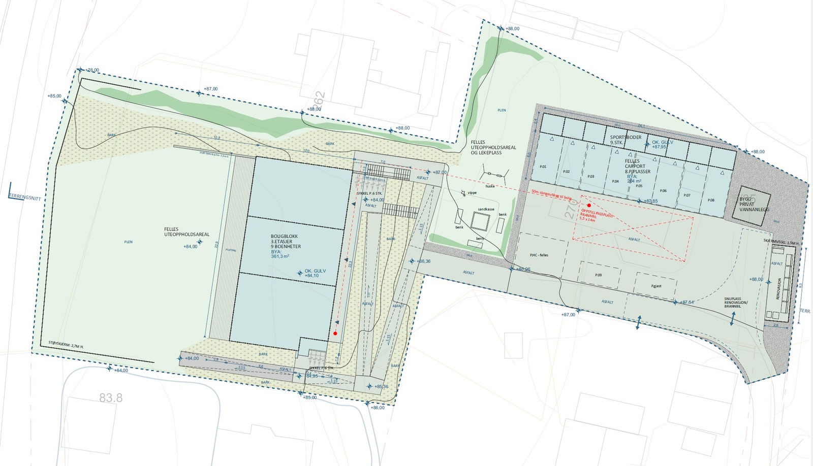 Alle leilighetene vil disponere 1 parkeringsplass/Carport (Leilighet 2 har ingen carport). Det legges også til rette for el-bil lader til alle leilighetene. Samt en gjeste parkering og en HC parkering.