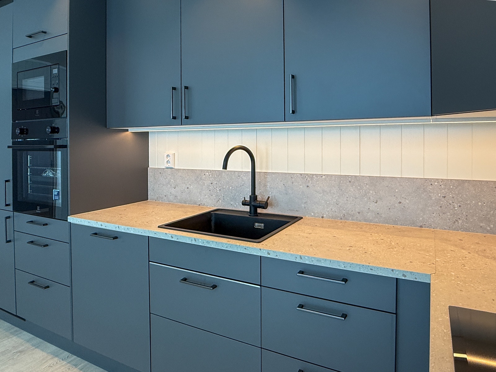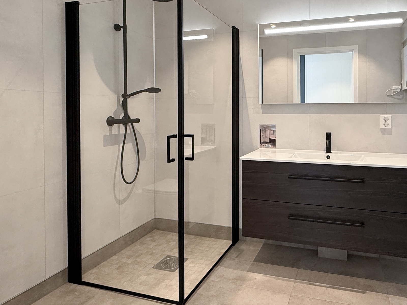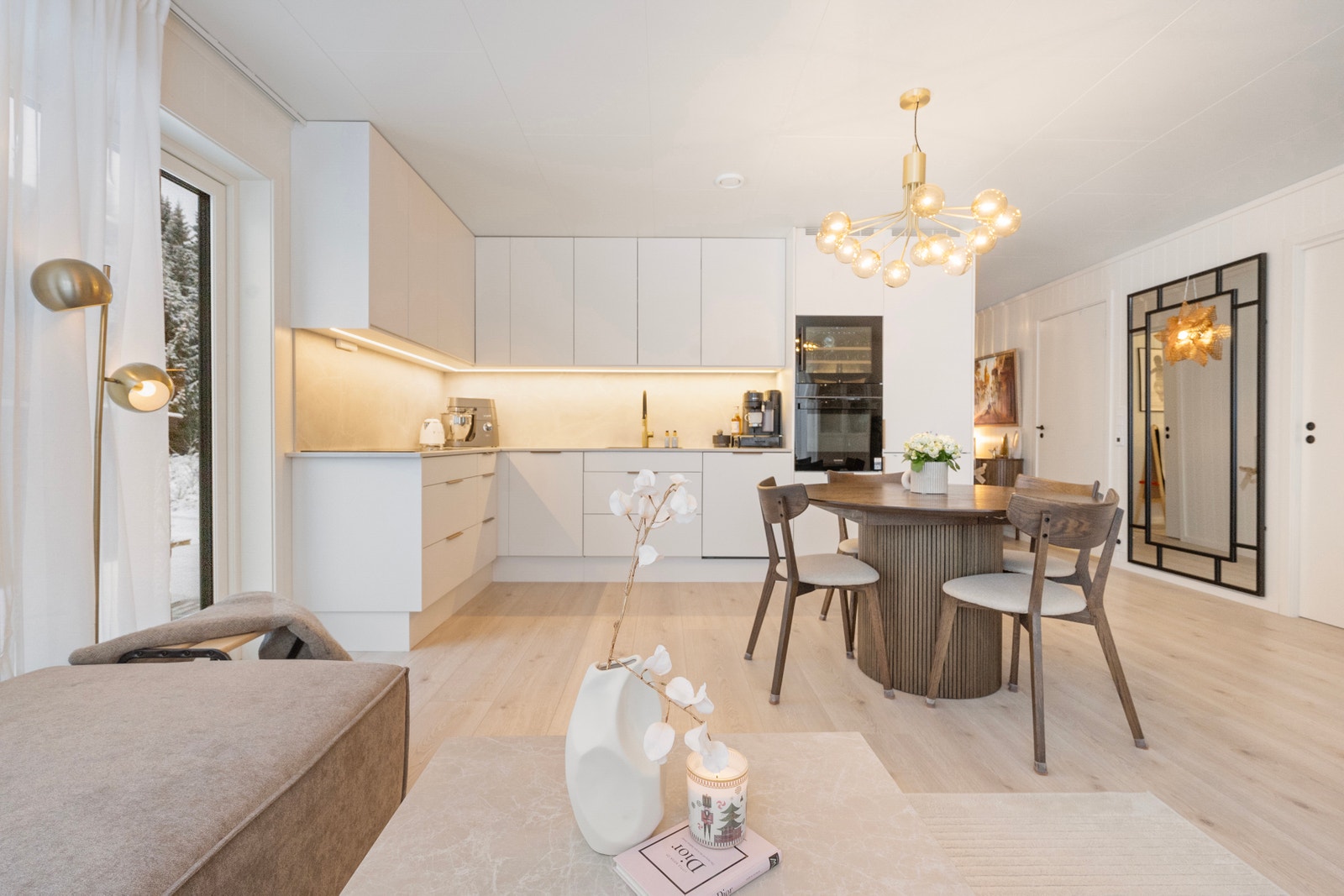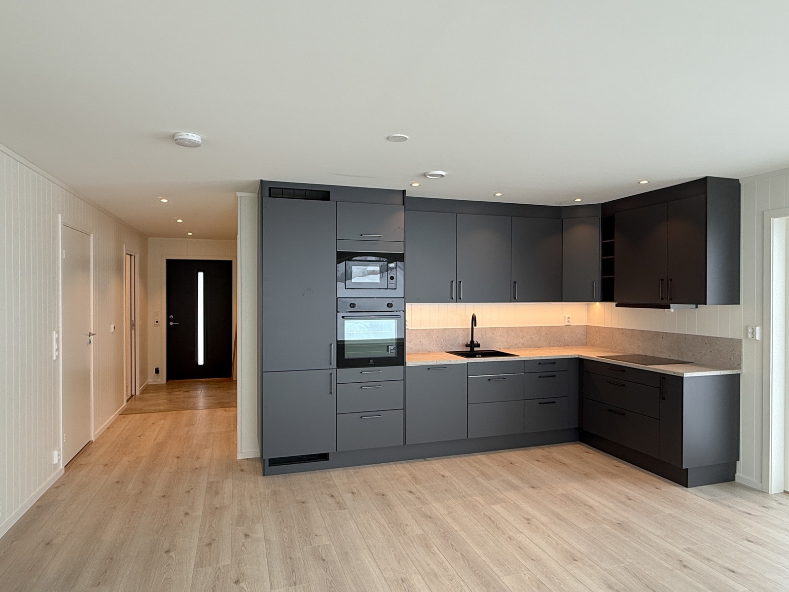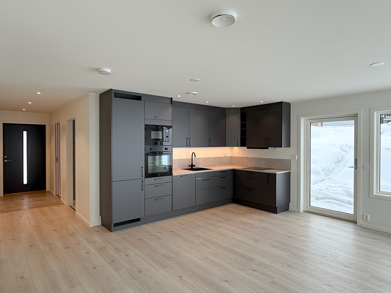 KVANT har åpen stue-/ kjøkkenløsning med flere vindusflater som slipper lyset inn. Her er også utgang til terrassen, så veien er kort for å hente forfriskninger. Bad med plass til vaskemaskinen og flislagt gang.