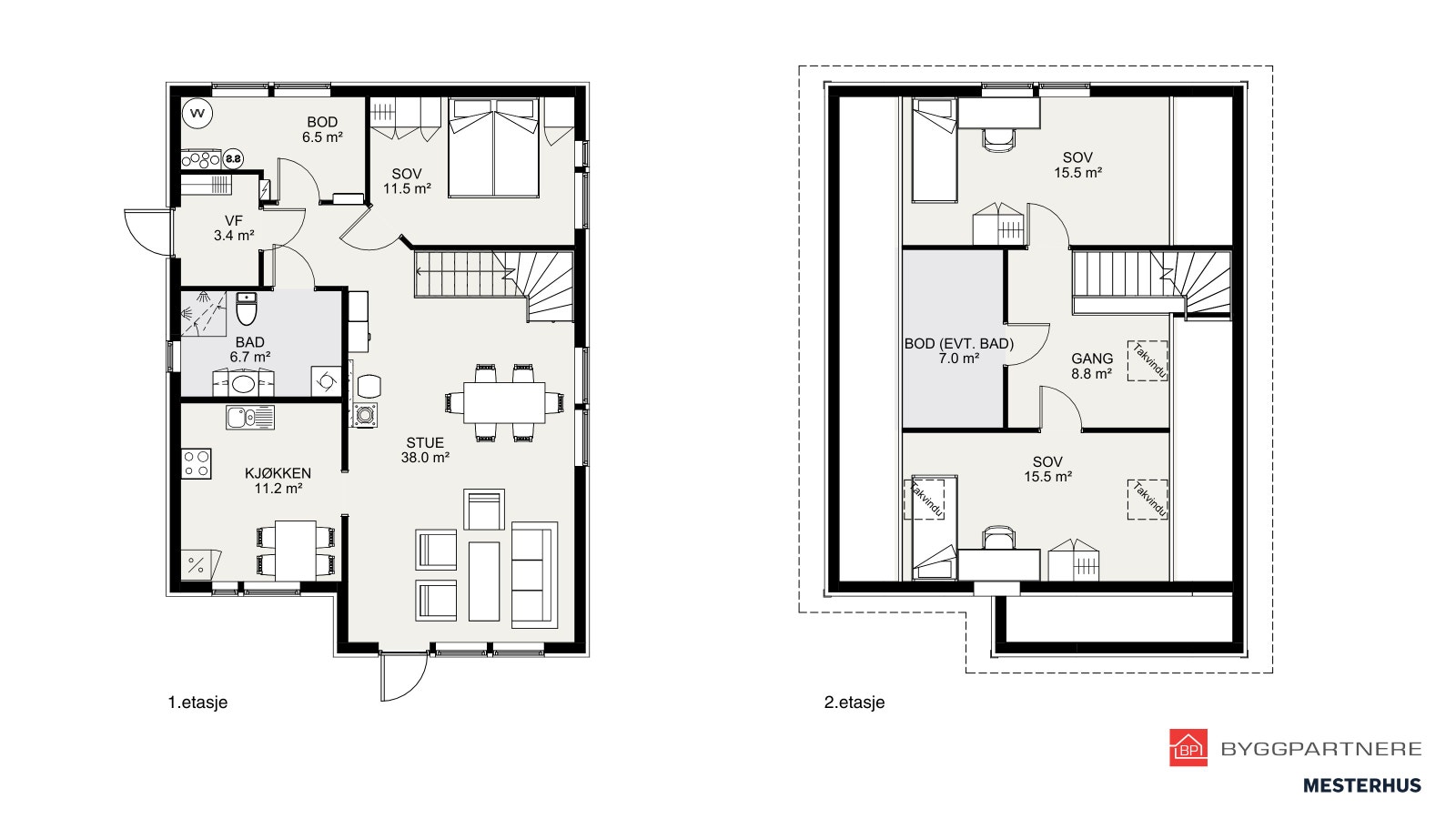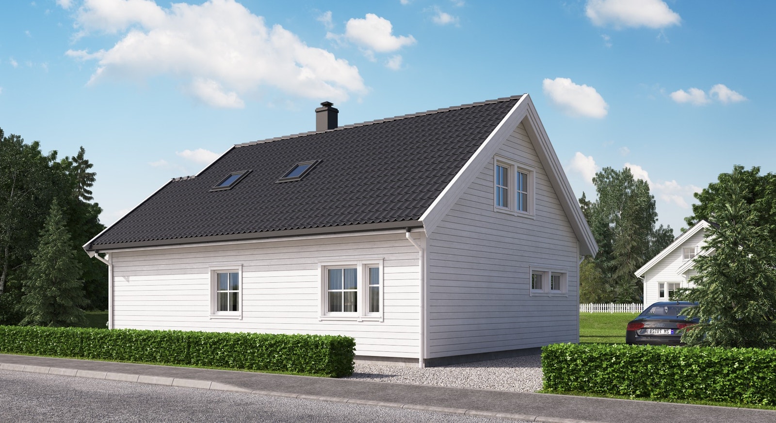 Her presenteres en tradisjonell bolig fra Mesterhus som kan bygges på tomten. Vi ønsker å gjøre det lettere å kjøpe ny bolig og er fleksible i ønsket løsning og leveranse. Her tilbyr vi muligheten til å gjøre egeninnsats ved å levere boligen uten innredet andre etasje. Alternativt leverer vi begge etasjer nøkkelferdige.