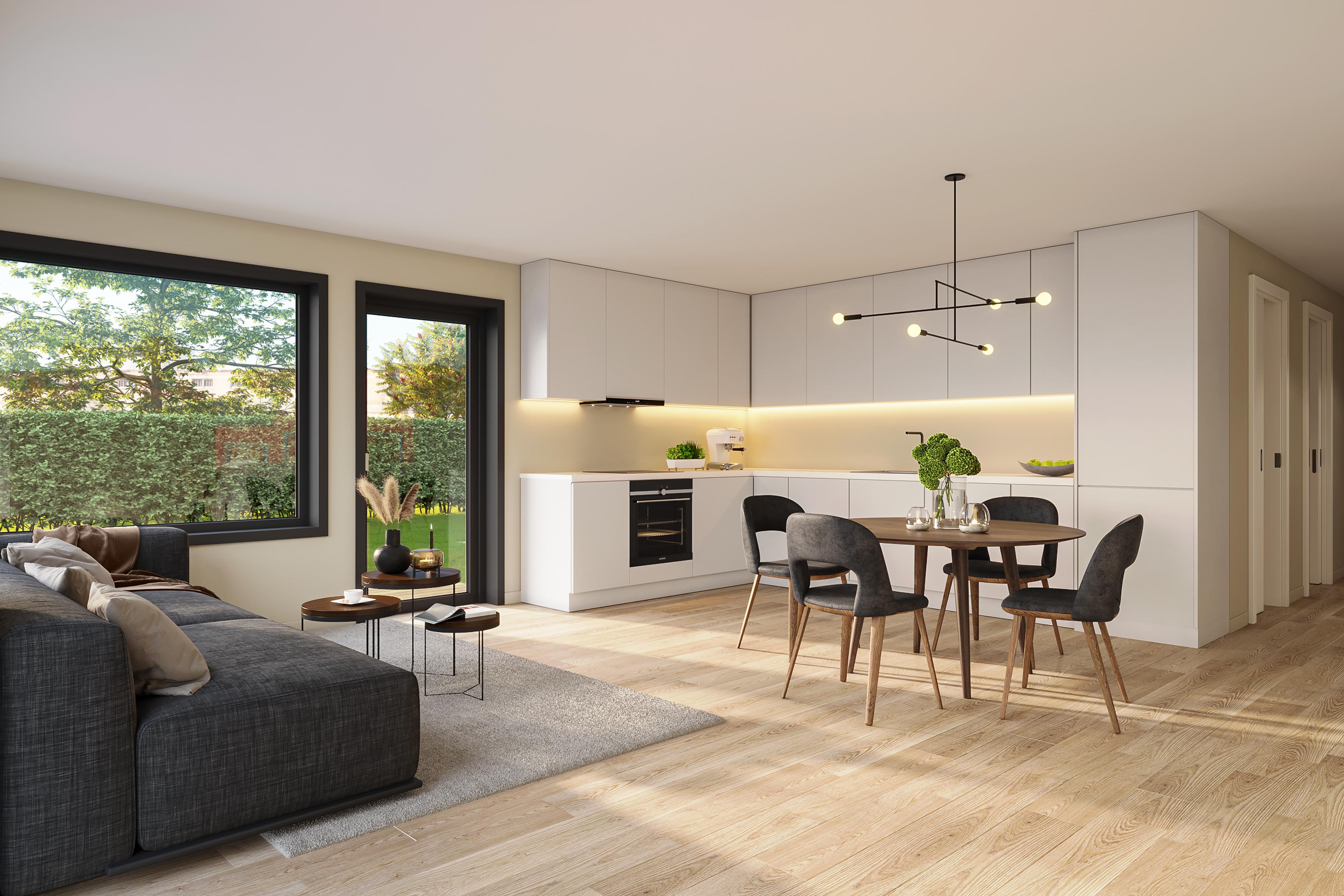Hjertet i KVANT 3.0 er den åpne og lyse stue- og kjøkkenløsningen. Her er det lett å samles rundt matlaging, lekser, middager og hverdagens små pauser. De store vindusflatene slipper inn godt med dagslys og skaper en lun og trivelig atmosfære – året rundt.